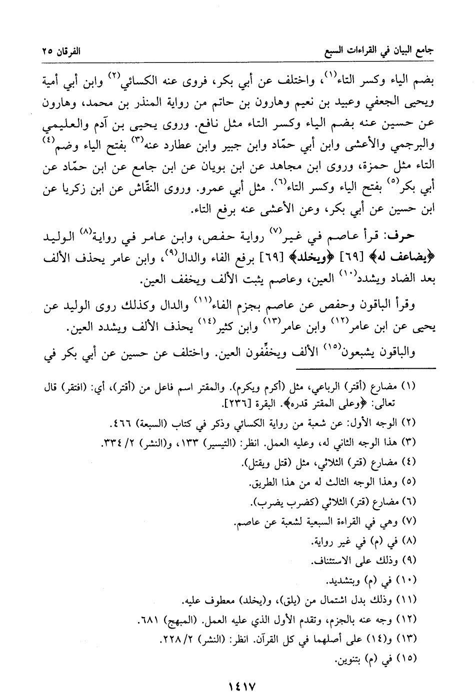قرأ عاصم في غير «7» رواية حفص، وابن عامر في رواية «8» الوليد يضاعف له [69] ويخلد [69] برفع الفاء والدال «9»، وابن عامر يحذف الألف بعد الضاد ويشدد «10» العين، وعاصم يثبت الألف ويخفف العين.