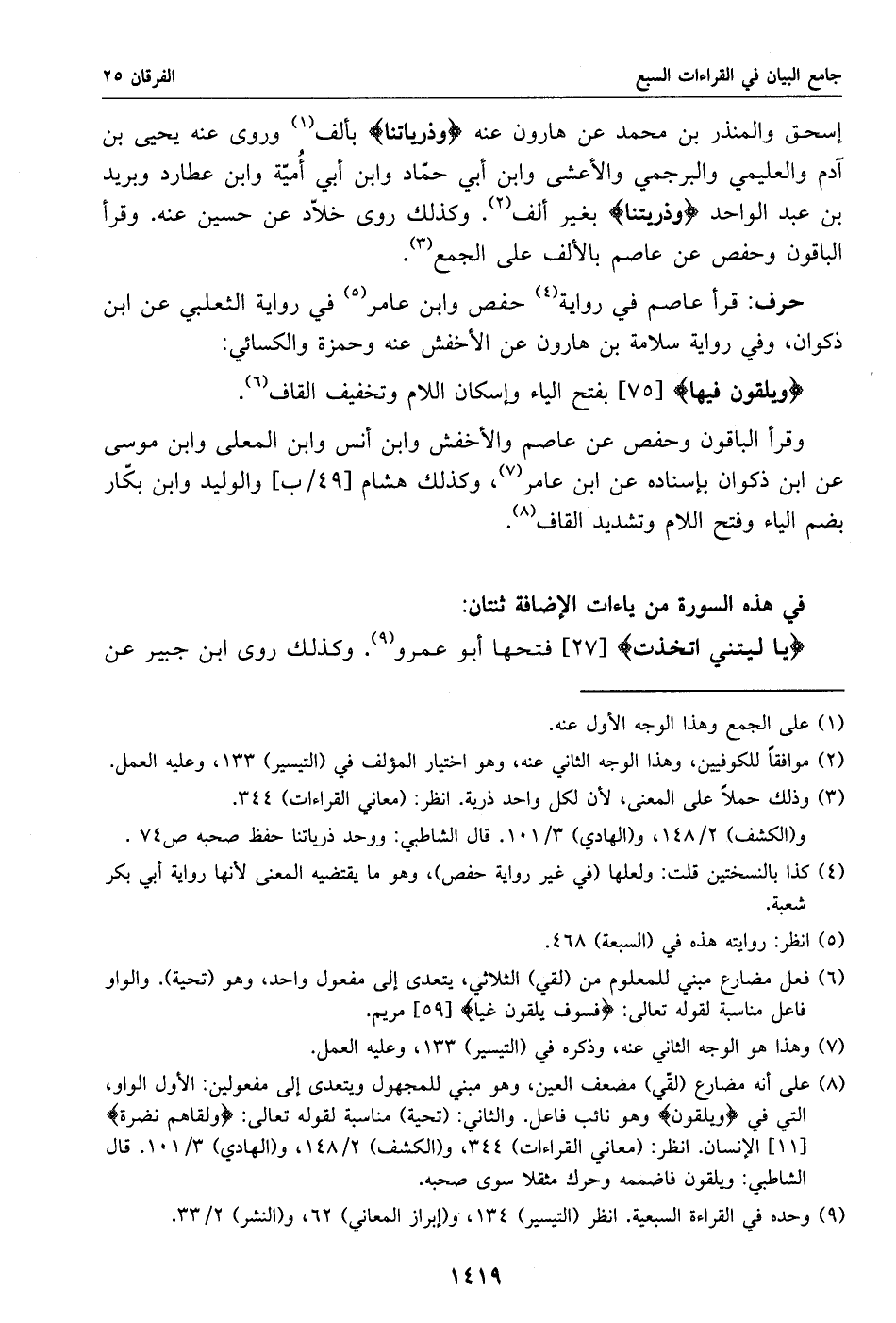 (8) على أنه مضارع (لقّي) مضعف العين، وهو مبني للمجهول ويتعدى إلى مفعولين: الأول الواو، التي في ويلقون وهو نائب فاعل. والثاني: (تحية) مناسبة لقوله تعالى: ولقاهم نضرة [11] الإنسان. انظر: (معاني القراءات) 344، و (الكشف) 2/ 148، و (الهادي) 3/ 101. قال الشاطبي: ويلقون فاضممه وحرك مثقلا سوى صحبه.