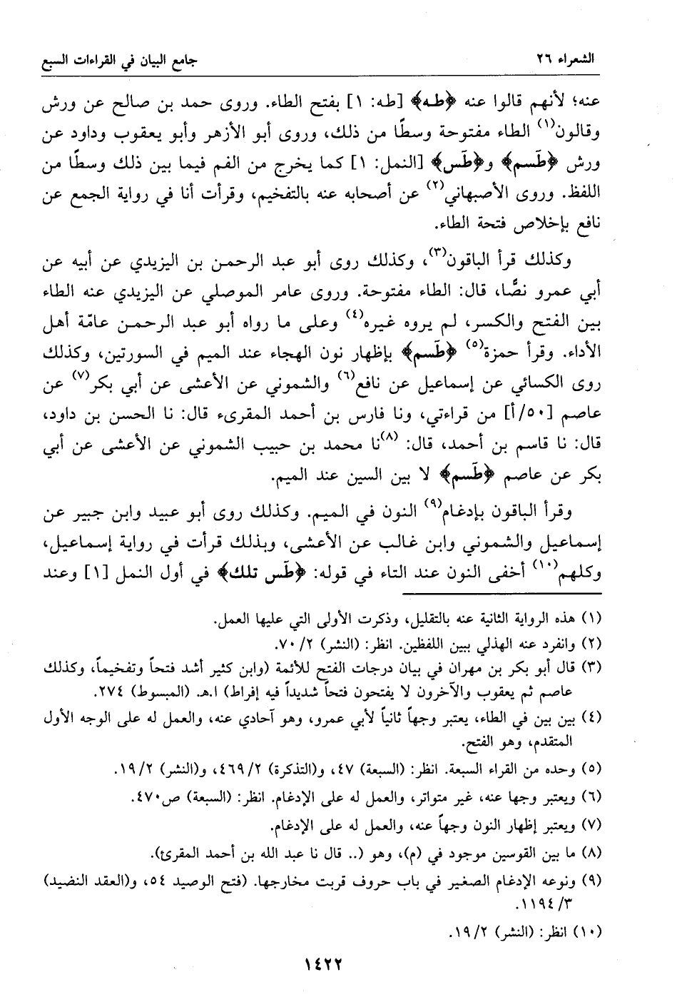 وكذلك قرأ الباقون «3»، وكذلك روى أبو عبد الرحمن بن اليزيدي عن أبيه عن أبي عمرو نصّا، قال: الطاء مفتوحة. وروى عامر الموصلي عن اليزيدي عنه الطاء بين الفتح والكسر، لم يروه غيره «4» وعلى ما رواه أبو عبد الرحمن عامّة أهل الأداء. وقرأ حمزة «5» طسم بإظهار نون الهجاء عند الميم في السورتين، وكذلك روى الكسائي عن إسماعيل عن نافع «6» والشموني عن الأعشى عن أبي بكر «7» عن عاصم [50/ أ] من قراءتي، ونا فارس بن أحمد المقرئ قال: نا الحسن بن داود، قال: نا قاسم بن أحمد، قال: «8» نا محمد بن حبيب الشموني عن الأعشى عن أبي بكر عن عاصم طسم لا بين السين عند الميم.