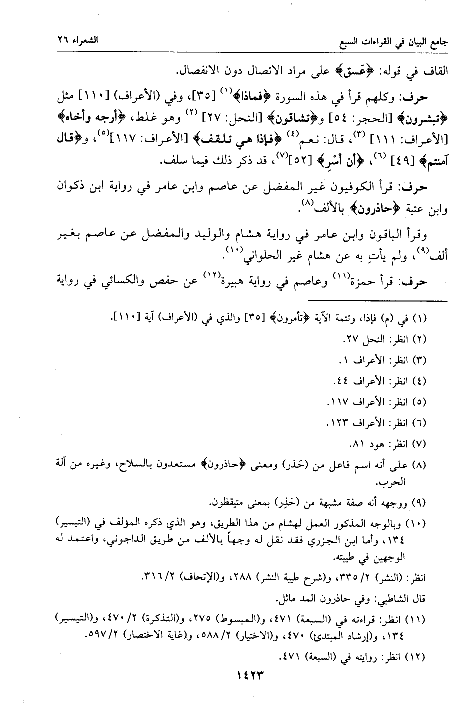 وكلهم قرأ في هذه السورة فماذا «1» [35]، وفي (الأعراف) [110] مثل تبشرون [الحجر: 54] وتشاقون [النحل: 27] «2» وهو غلط، أرجه وأخاه [الأعراف: 111] «3»، قال: نعم «4» فإذا هي تلقف [الأعراف: 117] «5»، وقال آمنتم [49] «6»، أن أسر [52] «7»، قد ذكر ذلك فيما سلف.