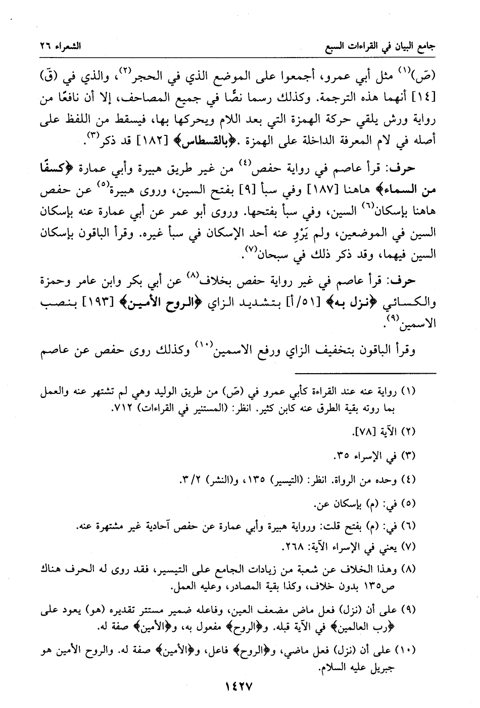 (8) وهذا الخلاف عن شعبة من زيادات الجامع على التيسير، فقد روى له الحرف هناك ص 135 بدون خلاف، وكذا بقية المصادر، وعليه العمل.