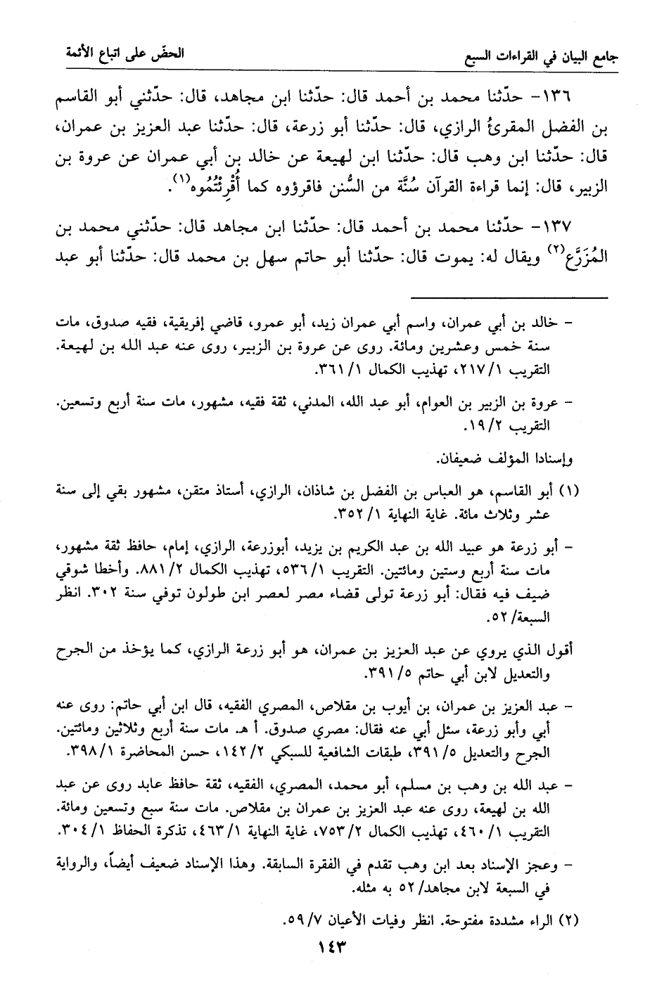 136 - حدّثنا محمد بن أحمد قال: حدّثنا ابن مجاهد، قال: حدّثني أبو القاسم بن الفضل المقرئ الرازي، قال: حدّثنا أبو زرعة، قال: حدّثنا عبد العزيز بن عمران، قال: حدّثنا ابن وهب قال: حدّثنا ابن لهيعة عن خالد بن أبي عمران عن عروة بن الزبير، قال: إنما قراءة القرآن سنّة من السّنن فاقرءوه كما أقرئتموه «1».