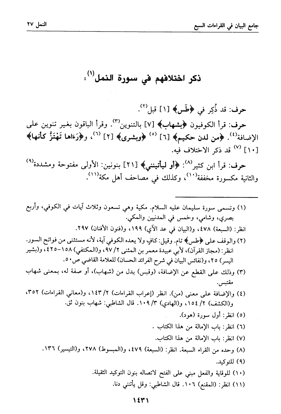 قرأ الكوفيون بشهاب [7] بالتنوين «3». وقرأ الباقون بغير تنوين على الإضافة «4». من لدن حكيم [6] «5» وبشرى [2] «6»، ورءاها تهتزّ كأنها [10] «7» قد ذكر الاختلاف فيه.