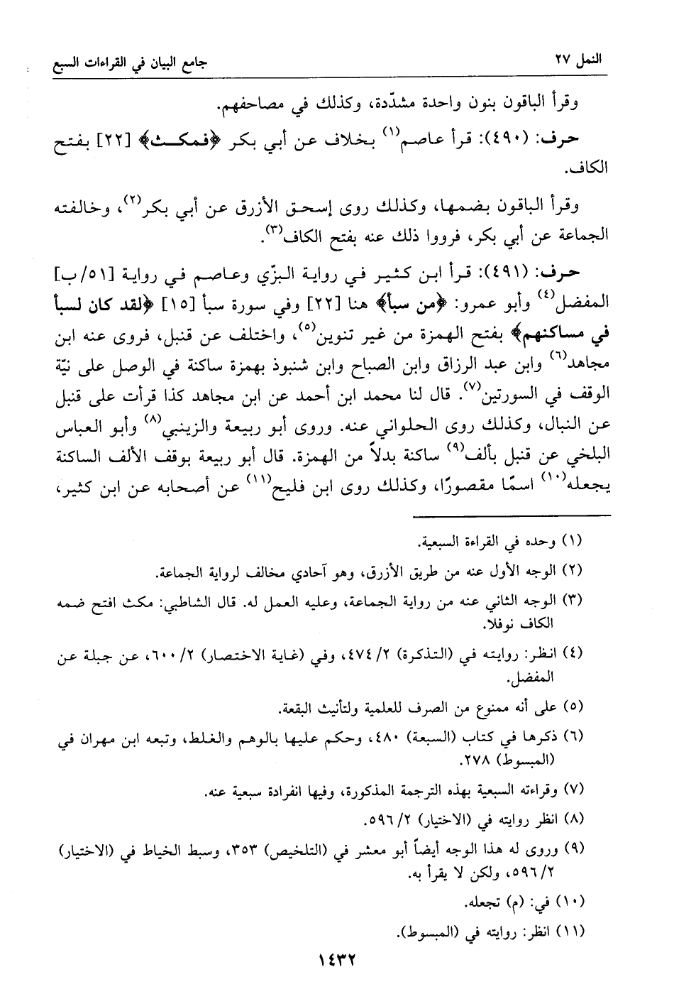 (491): قرأ ابن كثير في رواية البزّي وعاصم في رواية [51/ ب] المفضل «4» وأبو عمرو: من سبأ هنا [22] وفي سورة سبأ [15] لقد كان لسبأ في مساكنهم بفتح الهمزة من غير تنوين «5»، واختلف عن قنبل، فروى عنه ابن مجاهد «6» وابن عبد الرزاق وابن الصباح وابن شنبوذ بهمزة ساكنة في الوصل على نيّة الوقف في السورتين «7». قال لنا محمد ابن أحمد عن ابن مجاهد كذا قرأت على قنبل عن النبال، وكذلك روى الحلواني عنه. وروى أبو ربيعة والزينبي «8» وأبو العباس البلخي عن قنبل بألف «9» ساكنة بدلا من الهمزة. قال أبو ربيعة بوقف الألف الساكنة يجعله «10» اسما مقصورا، وكذلك روى ابن فليح «11» عن أصحابه عن ابن كثير،