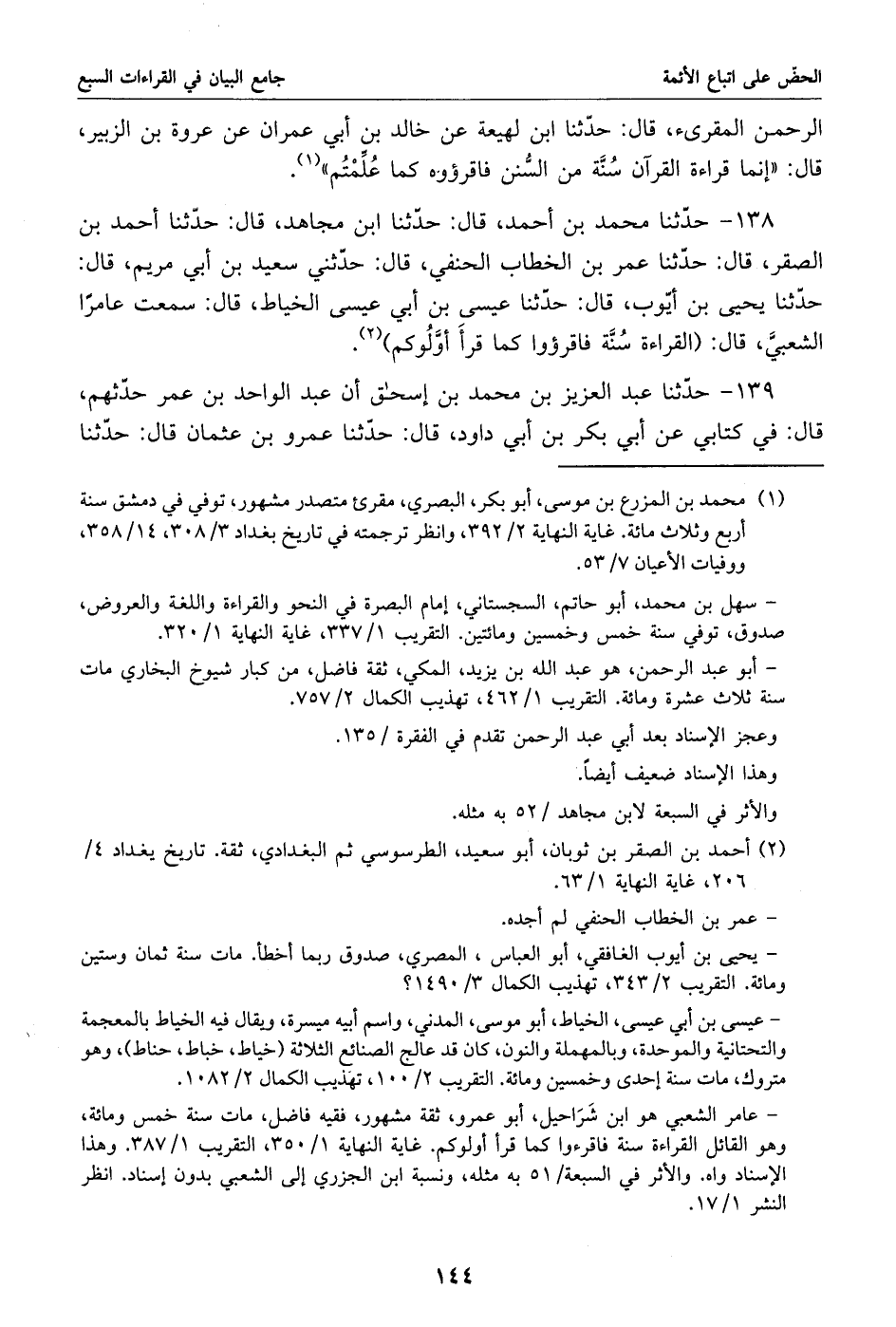 حدّثنا يحيى بن أيّوب، قال: حدّثنا عيسى بن أبي عيسى الخياط، قال: سمعت عامرا الشعبيّ، قال: (القراءة سنّة فاقرءوا كما قرأ أوّلوكم) «2».