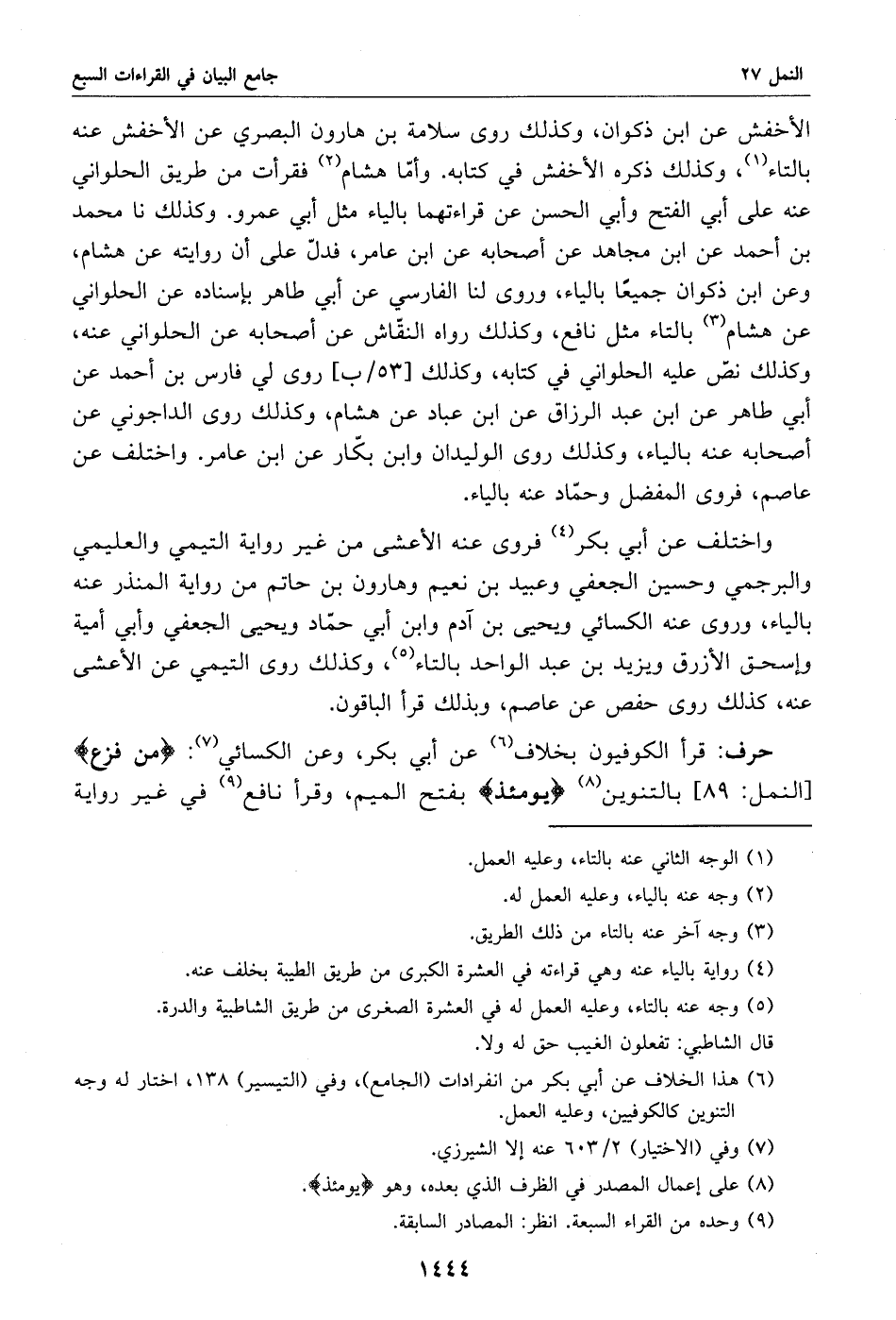 قرأ الكوفيون بخلاف «6» عن أبي بكر، وعن الكسائي «7»: من فزع [النمل: 89] بالتنوين «8» يومئذ بفتح الميم، وقرأ نافع «9» في غير رواية