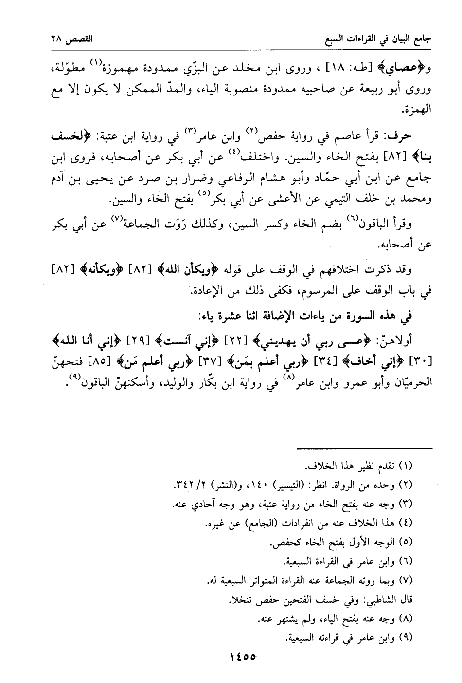 أولاهنّ: عسى ربي أن يهديني [22] إني آنست [29] إني أنا الله [30] إني أخاف [34] ربي أعلم بمن [37] ربي أعلم من [85] فتحهنّ الحرميّان وأبو عمرو وابن عامر «8» في رواية ابن بكّار والوليد، وأسكنهنّ الباقون «9».