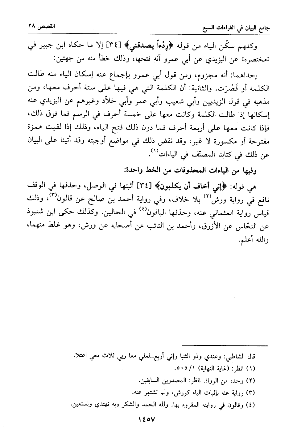 وكلهم سكّن الياء من قوله ردءا يصدقني [34] إلا ما حكاه ابن جبير في «مختصره» عن اليزيدي عن أبي عمرو أنه فتحها، وذلك خطأ منه من جهتين: