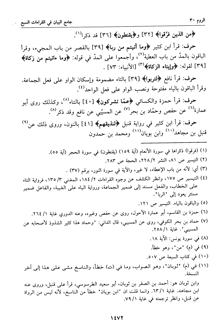 (4) التيسير ص 175، وانظر الكشف عن وجوه القراءات 2/ 184، المغني 3/ 135، فرواية التاء على الخطاب، والفعل مسند إلى ضمير الجماعة، ورواية الياء على الغيبة، والفاعل ضمير مستتر يعود إلى" الربا".