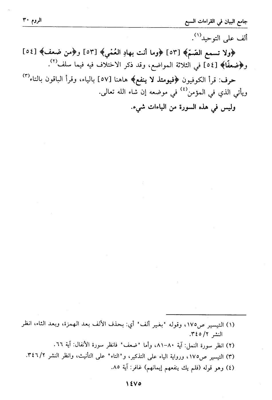ولا تسمع الصّمّ [53] وما أنت بهاد العمي [53] ومن ضعف [54] وضعفا [54] في الثلاثة المواضع، وقد ذكر الاختلاف فيه فيما سلف «2».