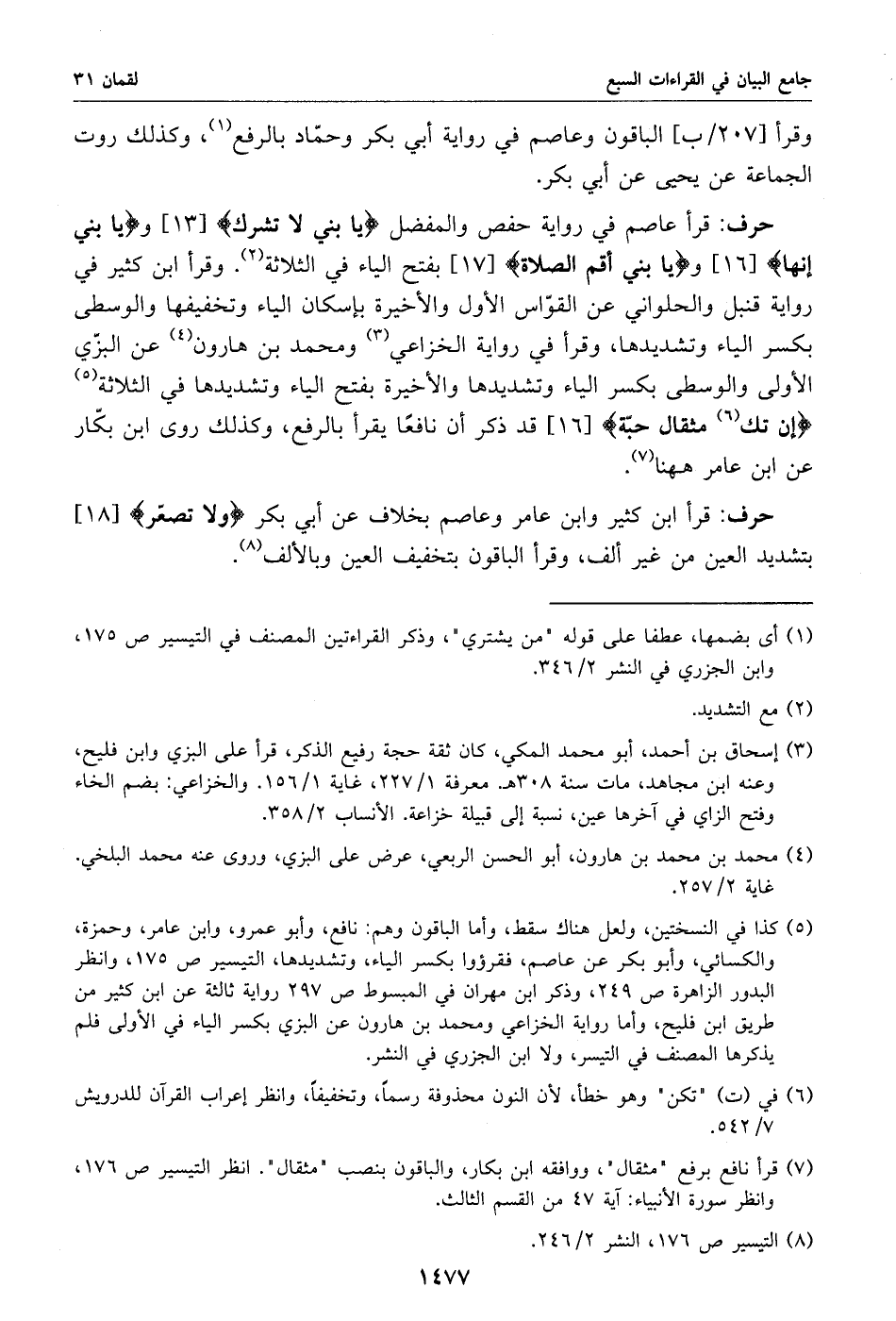 قرأ عاصم في رواية حفص والمفضل يا بني لا تشرك [13] ويا بني إنها [16] ويا بني أقم الصلاة [17] بفتح الياء في الثلاثة «2». وقرأ ابن كثير في رواية قنبل والحلواني عن القوّاس الأول والأخيرة بإسكان الياء وتخفيفها والوسطى بكسر الياء وتشديدها، وقرأ في رواية الخزاعي «3» ومحمد بن هارون «4» عن البزّي الأولى والوسطى بكسر الياء وتشديدها والأخيرة بفتح الياء وتشديدها في الثلاثة «5» إن تك «6» مثقال حبّة [16] قد ذكر أن نافعا يقرأ بالرفع، وكذلك روى ابن بكّار عن ابن عامر هاهنا «7».