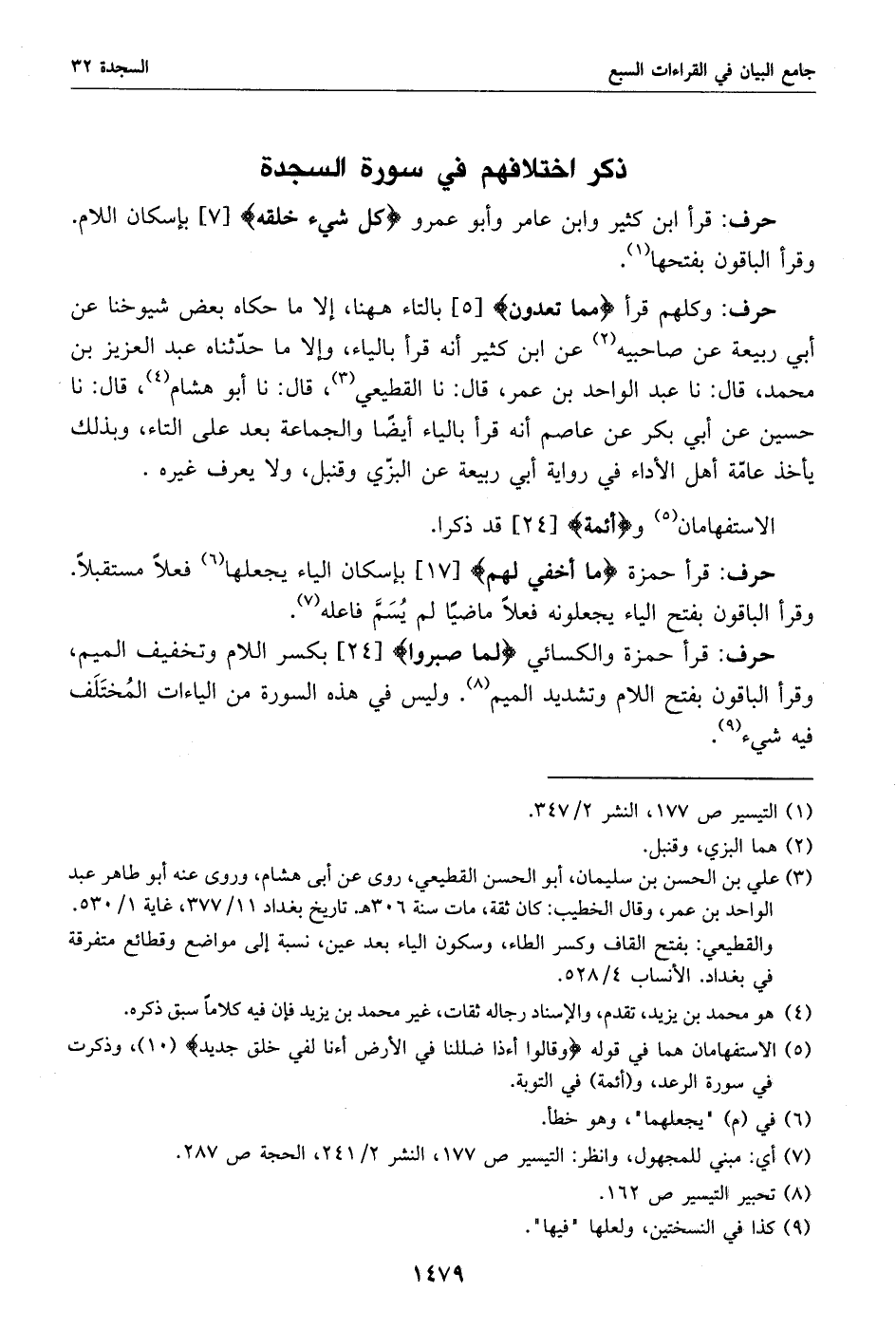 قرأ حمزة والكسائي لما صبروا [24] بكسر اللام وتخفيف الميم، وقرأ الباقون بفتح اللام وتشديد الميم «8». وليس في هذه السورة من الياءات المختلف فيه شيء «9».