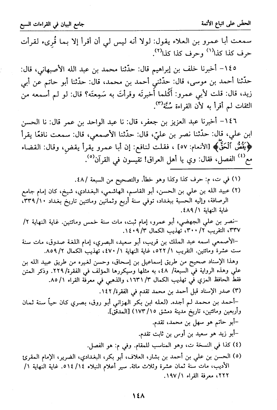 146 - أخبرنا عبد العزيز بن جعفر، قال: نا عبد الواحد بن عمر قال: نا الحسن ابن علي، قال: حدّثنا نصر بن عليّ، قال: حدّثنا الأصمعي، قال: سمعت نافعا يقرأ يقصّ الحقّ [الأنعام: 57]، فقلت لنافع: إن أبا عمرو يقرأ يقض، وقال: القضاء مع «4» الفصل، فقال: وي يا أهل العراق! تقيسون في القرآن «5».