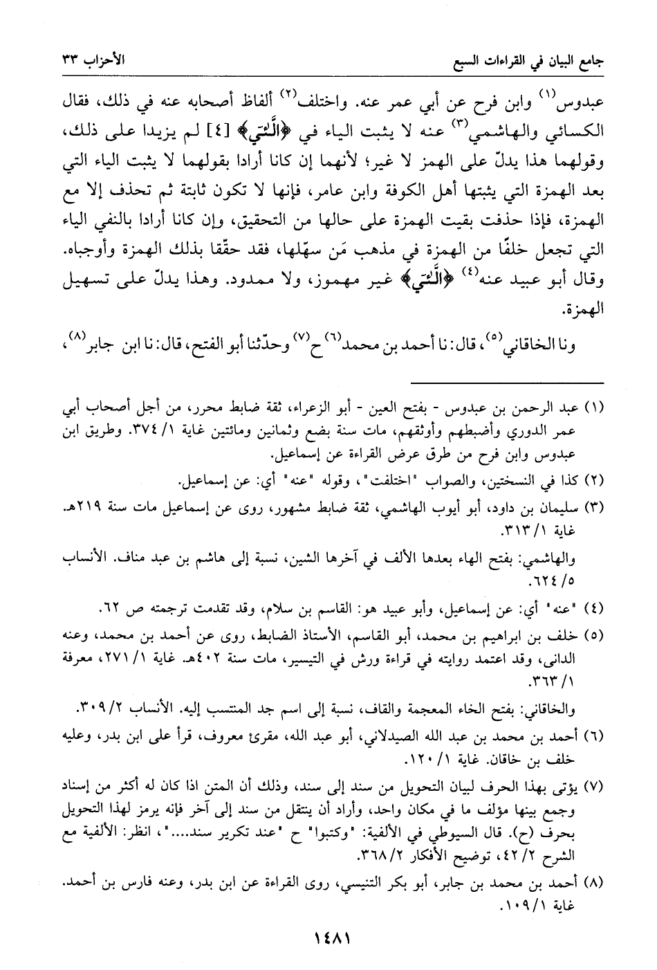 عبدوس «1» وابن فرح عن أبي عمر عنه. واختلف «2» ألفاظ أصحابه عنه في ذلك، فقال الكسائي والهاشمي «3» عنه لا يثبت الياء في الّئي [4] لم يزيدا على ذلك، وقولهما هذا يدلّ على الهمز لا غير؛ لأنهما إن كانا أرادا بقولهما لا يثبت الياء التي بعد الهمزة التي يثبتها أهل الكوفة وابن عامر، فإنها لا تكون ثابتة ثم تحذف إلا مع الهمزة، فإذا حذفت بقيت الهمزة على حالها من التحقيق، وإن كانا أرادا بالنفي الياء التي تجعل خلفا من الهمزة في مذهب من سهّلها، فقد حقّقا بذلك الهمزة وأوجباه.