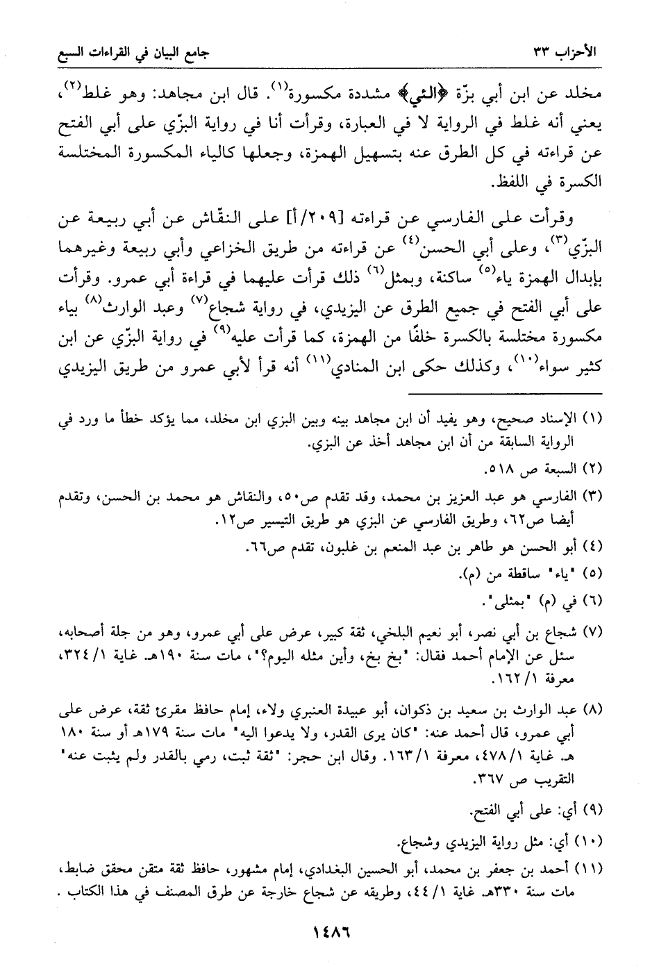 (1) الإسناد صحيح، وهو يفيد أن ابن مجاهد بينه وبين البزي ابن مخلد، مما يؤكد خطأ ما ورد في الرواية السابقة من أن ابن مجاهد أخذ عن البزي.