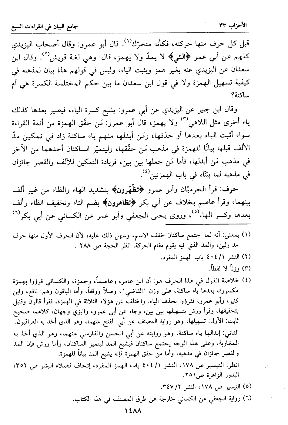 وقال ابن جبير عن اليزيدي عن أبي عمرو: يشبع كسرة الياء، فيصير بعدها كذلك ياء أخرى مثل اللاهي «3» ولا يهمز، قال أبو عمرو: من حقّق الهمزة من أئمة القراءة سواء أثبت الياء بعدها أو حذفها، ومن أبدلها منهم ياء ساكنة زاد في تمكين مدّ الألف قبلها بيانا للهمزة في مذهب من حقّقها، وليتميّز الساكنان أحدهما من الآخر في مذهب من أبدلها، فأما من جعلها بين بين، فزيادة التمكين للألف والقصر جائزان في مذهبه لما بيّنّاه في باب الهمزتين «4».