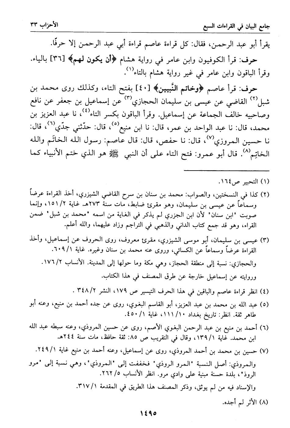 نا حسين المروزي «7»، قال: نا حفص، قال: قال عاصم: رسول الله الخاتم والله الخاتم «8». قال أبو عمرو: فتح التاء على أن النبي صلى الله عليه وسلم هو الذي ختم الأنبياء كما