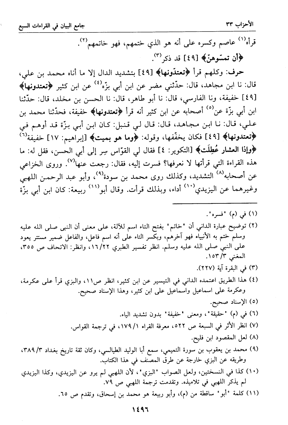 (2) توضيح عبارة الداني أن" خاتم" بفتح التاء اسم للآلة، على معنى أن النبى صلى الله عليه وسلم ختم به الأنبياء فهو آخرهم، وبكسر التاء على أنه اسم فاعل، والفاعل ضمير مستتر يعود على النبي صلى الله عليه وسلم. انظر تفسير الطبري 22/ 16، وانظر: الاتحاف ص 355، المغني 3/ 153.