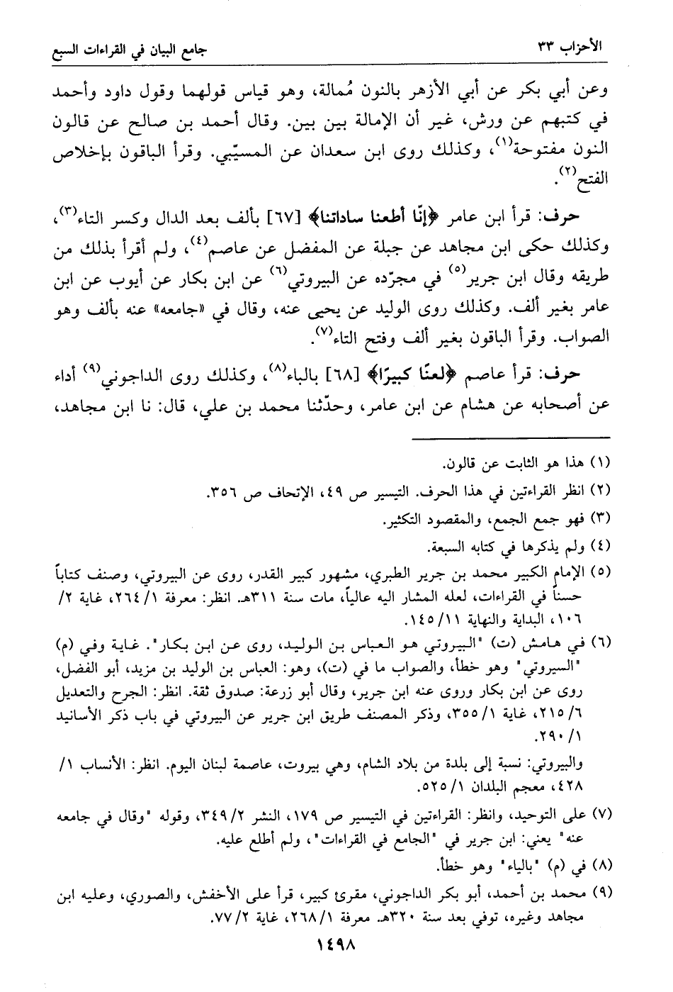 (5) الإمام الكبير محمد بن جرير الطبري، مشهور كبير القدر، روى عن البيروتي، وصنف كتابا حسنا في القراءات، لعله المشار اليه عاليا، مات سنة 311 هـ. انظر: معرفة 1/ 264، غاية 2/ 106، البداية والنهاية 11/ 145.