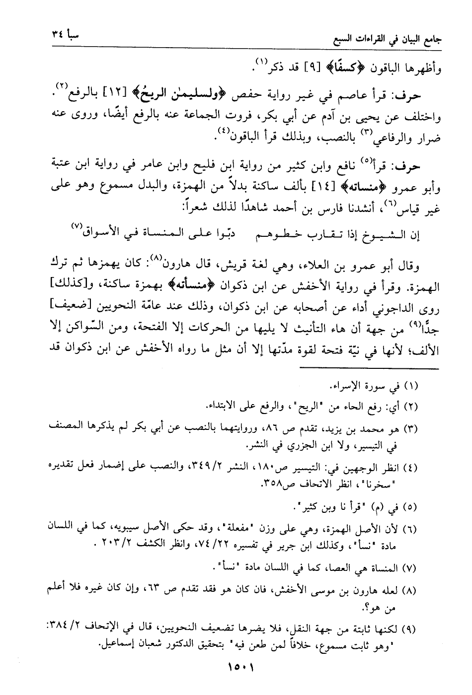 (6) لأن الأصل الهمزة، وهي على وزن" مفعلة"، وقد حكى الأصل سيبويه، كما في اللسان مادة" نسأ"، وكذلك ابن جرير في تفسيره 22/ 74، وانظر الكشف 2/ 203.