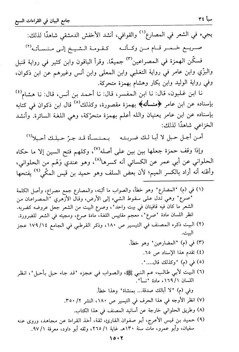 (6) البيت لأبي طالب، عم النبي صلّى الله عليه وسلم، والصواب في عجزه" قد جاء حبل بأحبل"، انظر اللسان 1/ 169، مادة" نسأ".