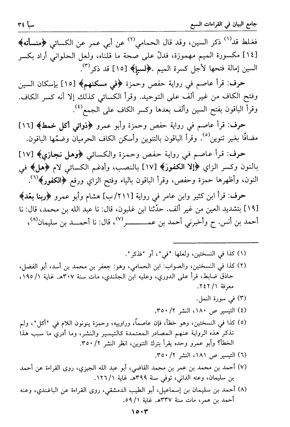 فغلط قد «1» ذكر السين، وقد قال الحمامي «2» عن أبي عمر عن الكسائي منسأته [14] مكسورة الميم مهموزة، فدلّ على صحة ما قلناه، ولعل الحلواني أراد بكسر السين إمالة فتحها لأجل كسرة الميم. لسبإ [15] قد ذكر «3».
