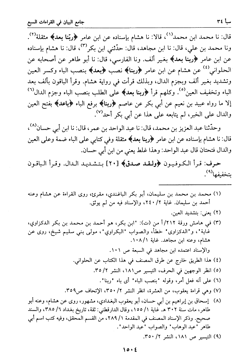 ونا محمد بن علي، قال: نا ابن مجاهد، قال: حدّثني ابن بكر «3»، قال: نا هشام بإسناده عن ابن عامر ربنا بعد بغير ألف. ونا الفارسي، قال: نا أبو طاهر عن أصحابه عن الحلواني «4» عن هشام عن ابن عامر ربنا نصب بعد بنصب الباء وكسر العين وتشديد بغير ألف وبجزم الدال، وبذلك قرأت في رواية هشام. وقرأ الباقون بألف بعد الباء وتخفيف العين «5». وكلهم قرأ ربنا بعد على الطلب بنصب الباء وجزم الدال «6» إلا ما رواه عبيد بن نعيم عن أبي بكر عن عاصم ربنا برفع الباء باعد بفتح العين والدال على الخبر، لم يتابعه على هذا عن أبي بكر أحد «7».