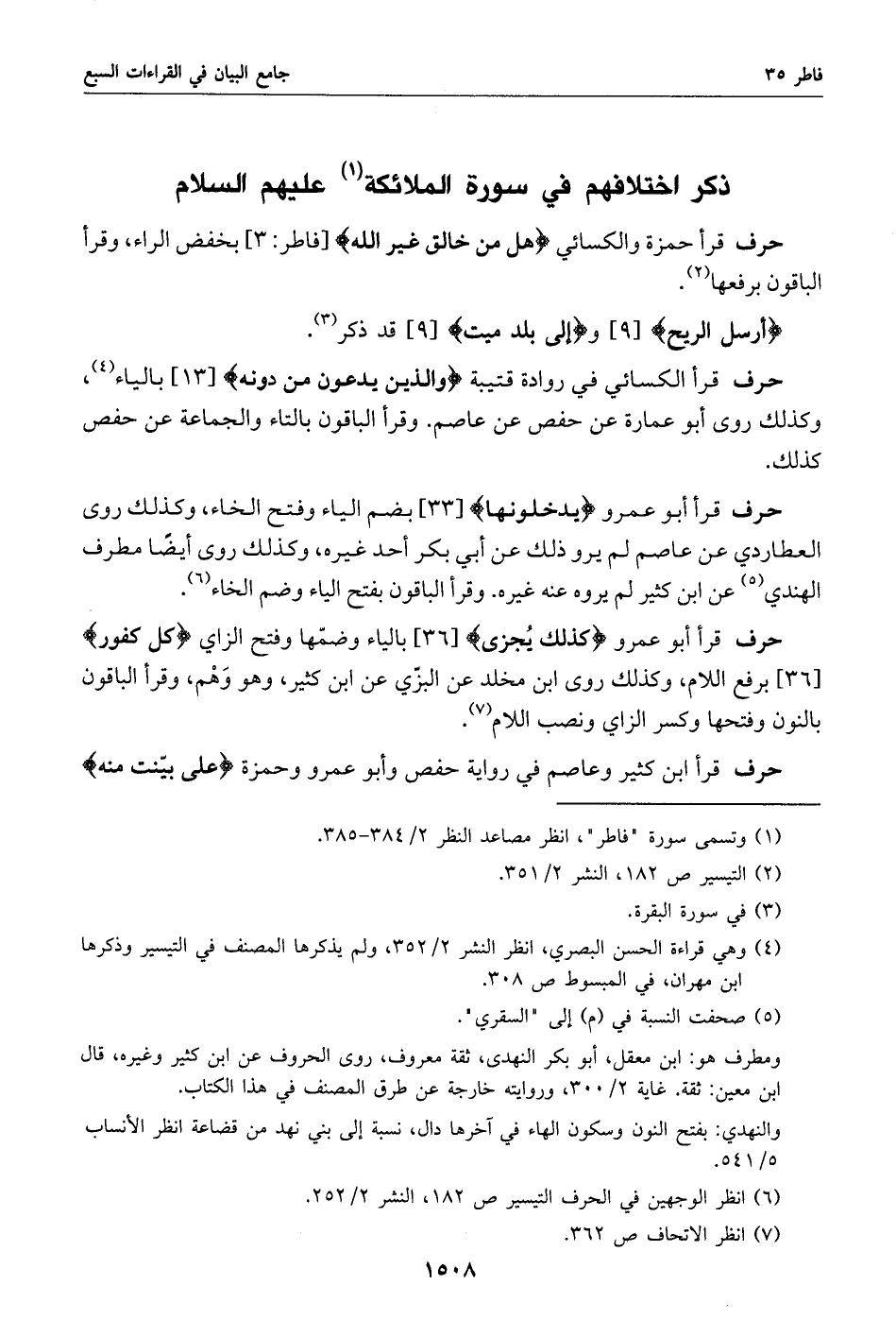 حرف قرأ أبو عمرو كذلك يجزى [36] بالياء وضمّها وفتح الزاي كل كفور [36] برفع اللام، وكذلك روى ابن مخلد عن البزّي عن ابن كثير، وهو وهم، وقرأ الباقون بالنون وفتحها وكسر الزاي ونصب اللام «7».