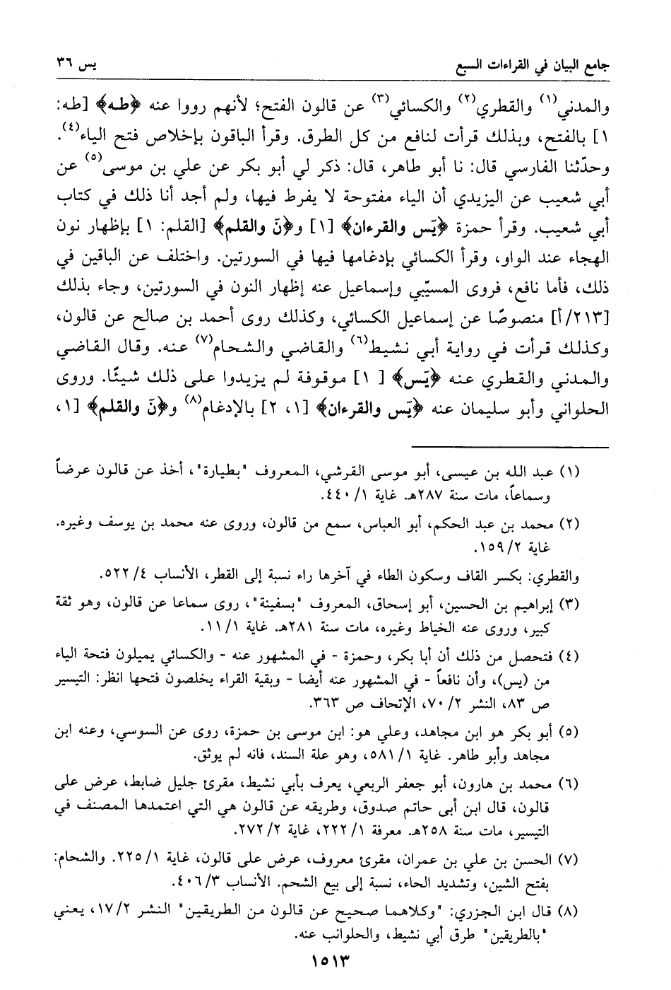 (4) فتحصل من ذلك أن أبا بكر، وحمزة- في المشهور عنه- والكسائي يميلون فتحة الياء من (يس)، وأن نافعا- في المشهور عنه أيضا- وبقية القراء يخلصون فتحها انظر: التيسير ص 83، النشر 2/ 70، الإتحاف ص 363.