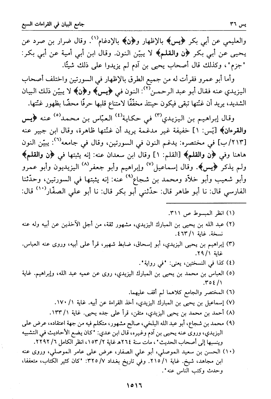 وقال إبراهيم بن اليزيدي «3» في حكاية «4» العبّاس بن محمد «5» عنه يس والقرءان [يس: 1] خفيفة غير مدغمة يريد أن غنّتها ظاهرة، وقال ابن جبير عنه [213/ ب] في مختصره: يدغم النون في السورتين، وقال في جامعه «6»: يبيّن النون هاهنا وفي ن والقلم [القلم: 1] وقال ابن سعدان عنه: إنه يثبتها في ن والقلم ولم يذكر يس. وقال إسماعيل «7» وإبراهيم وأبو جعفر «8» اليزيديون وأبو عمرو وأبو شعيب وأبو خلّاد ومحمد بن شجاع «9» عنه: إنه يثبتها في السورتين، وحدّثنا الفارسي قال: نا أبو طاهر قال: حدّثني أبو بكر قال: نا أبو علي الصفّار «10» قال: