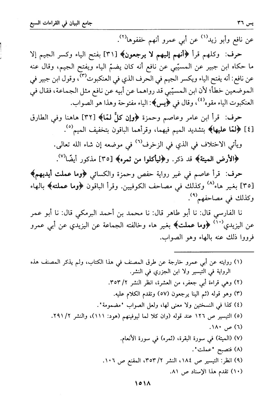 وكلهم قرأ أنهم إليهم لا يرجعون [31] بفتح الياء وكسر الجيم إلا ما حكاه ابن جبير عن المسيّبي عن نافع أنه كان يضمّ الياء ويفتح الجيم، وقال عنه عن نافع: أنه يفتح الياء ويكسر الجيم في الحرف الذي في العنكبوت «3»، وقول ابن جبير في الموضعين خطأ؛ لأن ابن المسيّبي قد رواهما عن أبيه عن نافع مثل الجماعة، فقال في العنكبوت الياء مقوه «4»، وقال في يس: الياء مفتوحة وهذا هو الصواب.
