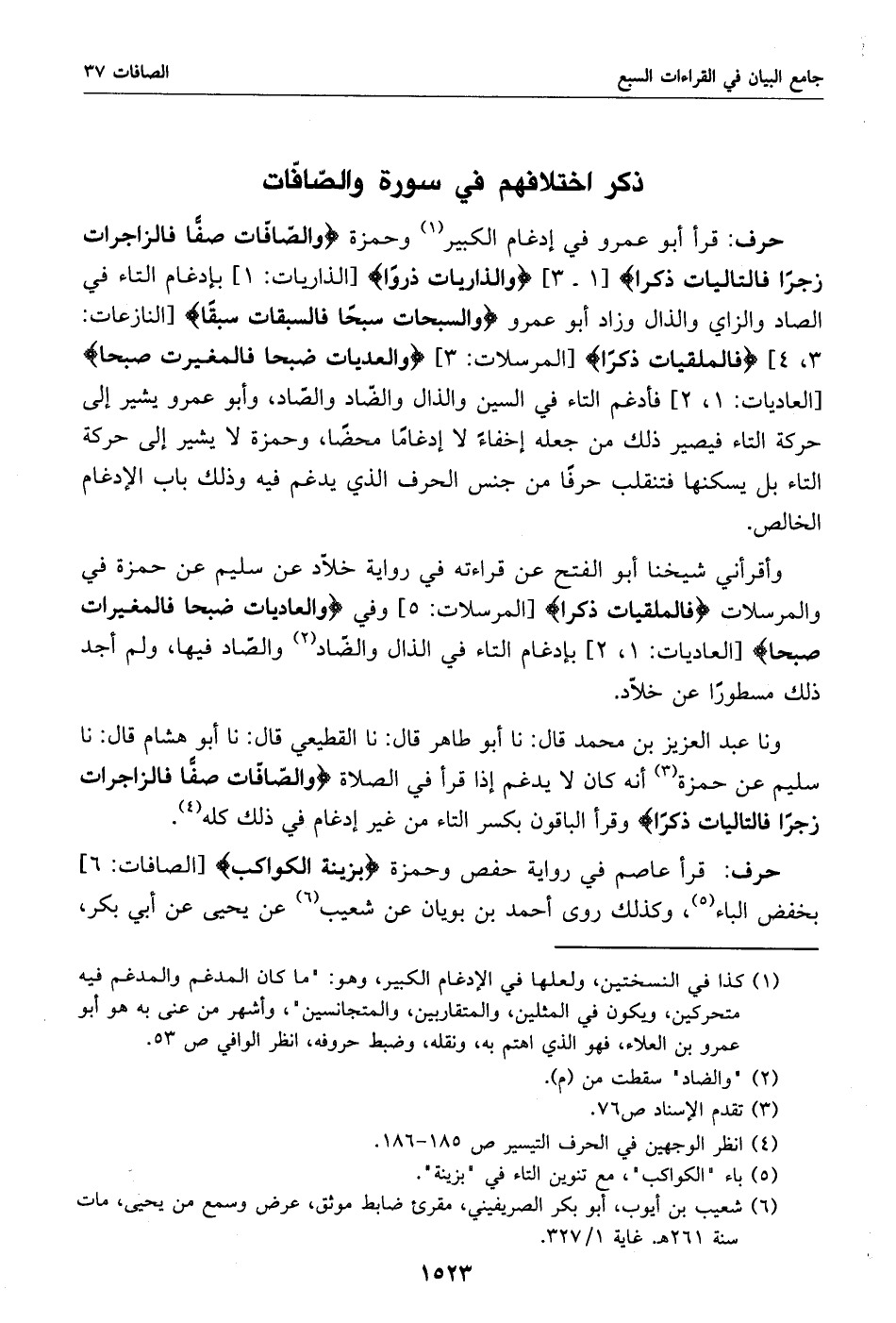 ونا عبد العزيز بن محمد قال: نا أبو طاهر قال: نا القطيعي قال: نا أبو هشام قال: نا سليم عن حمزة «3» أنه كان لا يدغم إذا قرأ في الصلاة والصّافّات صفّا فالزاجرات زجرا فالتاليات ذكرا وقرأ الباقون بكسر التاء من غير إدغام في ذلك كله «4».