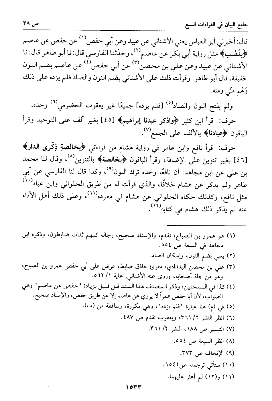 (4) كذا في النسختين، وذكر المصنف هذا السند قبل قليل بزيادة" حفص عن عاصم" وهي الصواب، لأن أبا حفص عمرا لا يروي عن عاصم إلا عن طريق حفص، والإسناد صحيح.