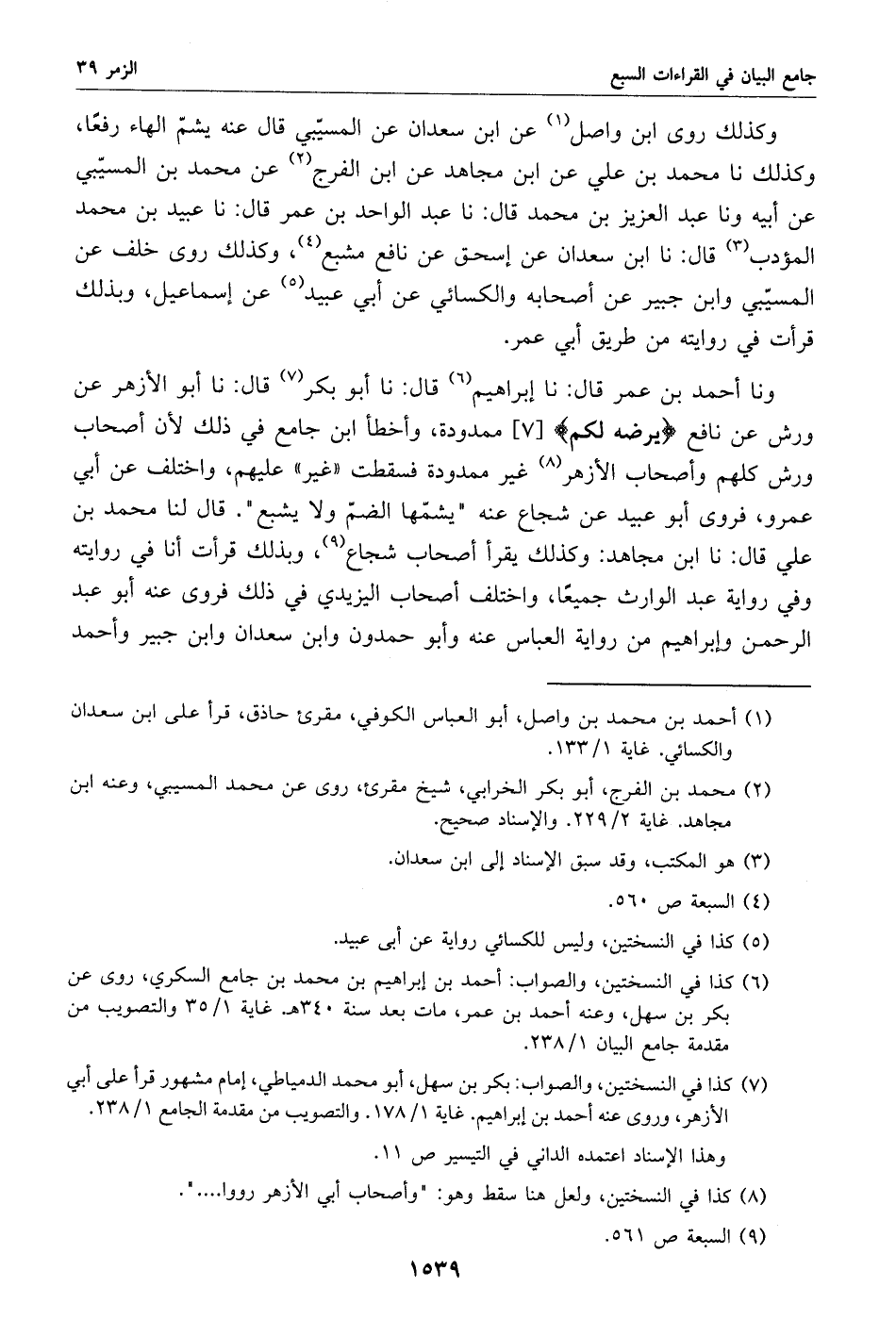 (7) كذا في النسختين، والصواب: بكر بن سهل، أبو محمد الدمياطي، إمام مشهور قرأ على أبي الأزهر، وروى عنه أحمد بن إبراهيم. غاية 1/ 178. والتصويب من مقدمة الجامع 1/ 238.