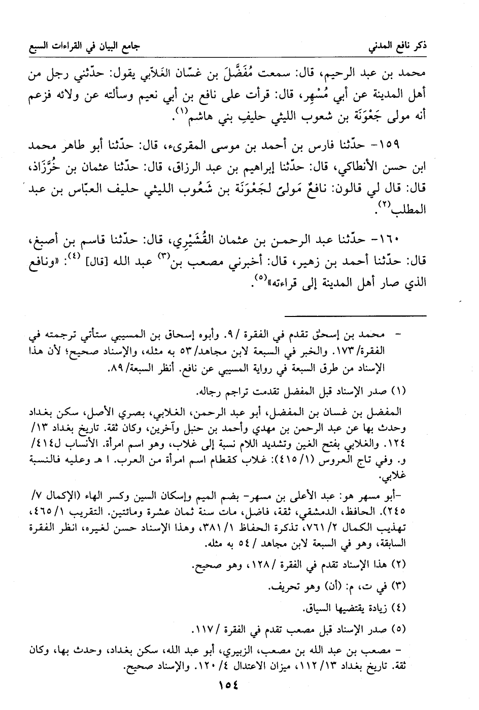 160 - حدّثنا عبد الرحمن بن عثمان القشيري، قال: حدّثنا قاسم بن أصبغ، قال: حدّثنا أحمد بن زهير، قال: أخبرني مصعب بن «3» عبد الله [قال] «4»: «ونافع الذي صار أهل المدينة إلى قراءته» «5».