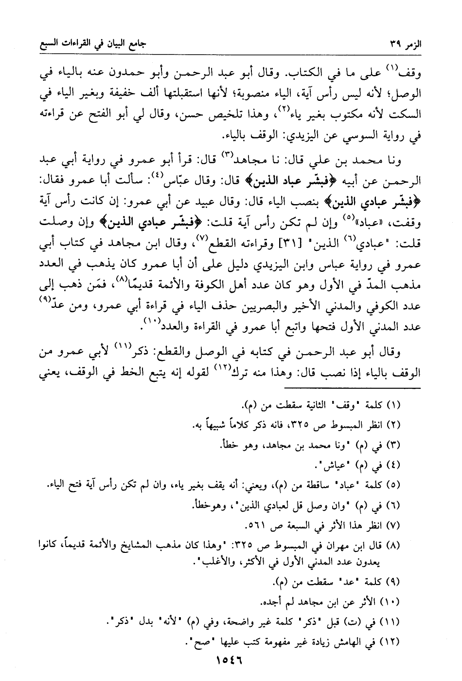 فبشّر عبادي الذين بنصب الياء قال: وقال عبيد عن أبي عمرو: إن كانت رأس آية وقفت، «عباد» «5» وإن لم تكن رأس آية قلت: فبشّر عبادي الذين وإن وصلت قلت:" عبادي «6» الذين" [31] وقراءته القطع «7»، وقال ابن مجاهد في كتاب أبي عمرو في رواية عباس وابن اليزيدي دليل على أن أبا عمرو كان يذهب في العدد مذهب المدّ