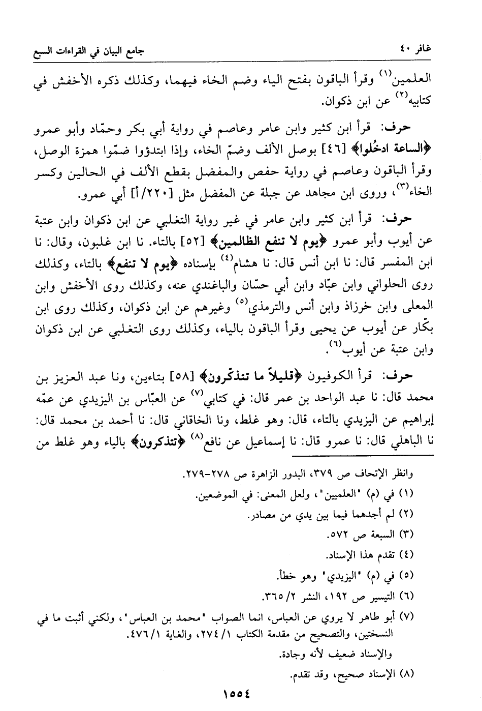 قرأ الكوفيون قليلا ما تتذكّرون [58] بتاءين، ونا عبد العزيز بن محمد قال: نا عبد الواحد بن عمر قال: في كتابي «7» عن العبّاس بن اليزيدي عن عمّه إبراهيم عن اليزيدي بالتاء، قال: وهو غلط، ونا الخاقاني قال: نا أحمد بن محمد قال: