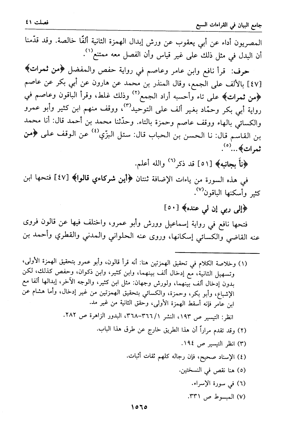 قرأ نافع وابن عامر وعاصم في رواية حفص والمفضل من ثمرات [47] بالألف على الجمع، وقال المنذر بن محمد عن هارون عن أبي بكر عن عاصم من ثمرات على تاء وأحسبه أراد الجمع «2» وذلك غلط، وقرأ الباقون وعاصم في رواية أبي بكر وحمّاد بغير ألف على التوحيد «3»، ووقف منهم ابن كثير وأبو عمرو والكسائي بالهاء ووقف عاصم وحمزة بالتاء. وحدّثنا محمد بن أحمد قال: أنا محمد بن القاسم قال: نا الحسن بن الحباب قال: سئل البزّي «4» عن الوقف على من ثمرات ... «5».