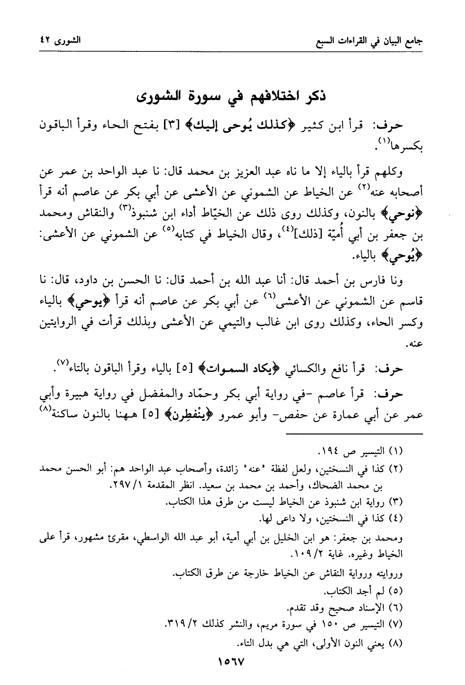 وكلهم قرأ بالياء إلا ما ناه عبد العزيز بن محمد قال: نا عبد الواحد بن عمر عن أصحابه عنه «2» عن الخياط عن الشموني عن الأعشى عن أبي بكر عن عاصم أنه قرأ نوحي بالنون، وكذلك روى ذلك عن الخيّاط أداء ابن شنبوذ «3» والنقاش ومحمد بن جعفر بن أبي أميّة [ذلك] «4»، وقال الخياط في كتابه «5» عن الشموني عن الأعشى: