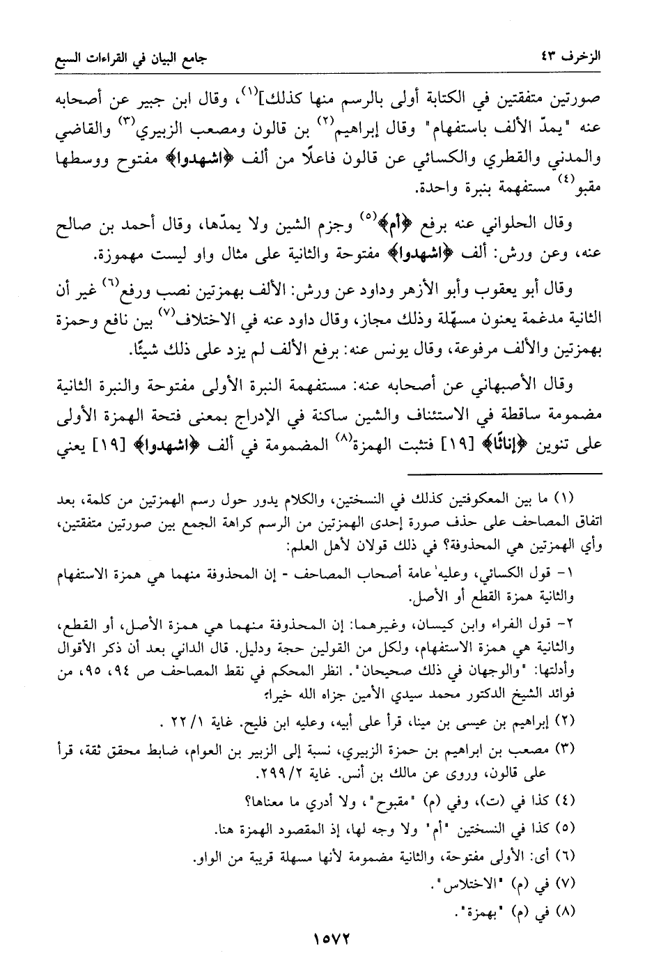 (1) ما بين المعكوفتين كذلك في النسختين، والكلام يدور حول رسم الهمزتين من كلمة، بعد اتفاق المصاحف على حذف صورة إحدى الهمزتين من الرسم كراهة الجمع بين صورتين متفقتين، وأي الهمزتين هي المحذوفة؟ في ذلك قولان لأهل العلم: