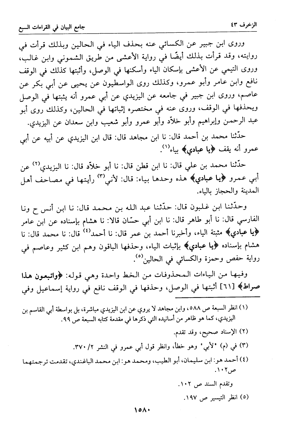 وحدّثنا ابن غلبون قال: حدّثنا عبد الله بن محمد قال: نا ابن أنس ح ونا الفارسي قال: نا أبو طاهر قال: نا ابن أبي حسّان قالا: نا هشام بإسناده عن ابن عامر يا عبادي مثبتة الياء، وأخبرنا أحمد بن عمر قال: نا أحمد «4» قال: نا محمد قال: نا هشام بإسناده يا عبادي بإثبات الياء، وحذفها الباقون وهم ابن كثير وعاصم في رواية حفص وحمزة والكسائي في الحالين «5».