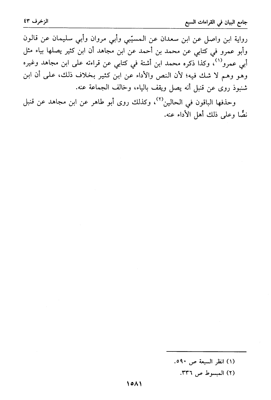وحذفها الباقون في الحالين «2»، وكذلك روى أبو طاهر عن ابن مجاهد عن قنبل نصّا وعلى ذلك أهل الأداء عنه.