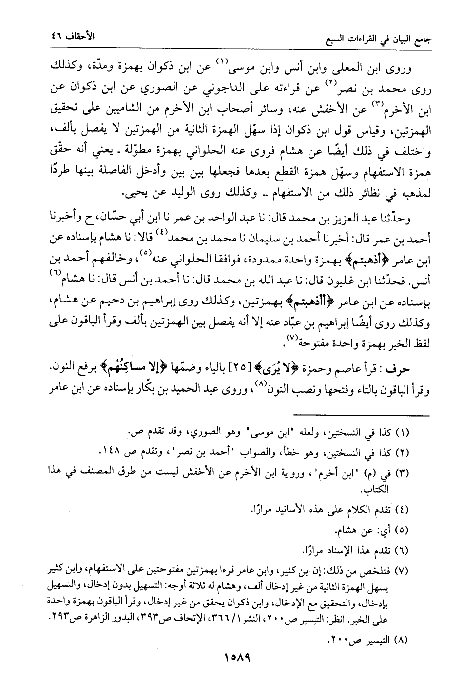 (7) فتلخص من ذلك: إن ابن كثير، وابن عامر قرءا بهمزتين مفتوحتين على الاستفهام، وابن كثير يسهل الهمزة الثانية من غير إدخال ألف، وهشام له ثلاثة أوجه: التسهيل بدون إدخال، والتسهيل بإدخال، والتحقيق مع الإدخال، وابن ذكوان يحقق من غير إدخال، وقرأ الباقون بهمزة واحدة على الخبر. انظر: التيسير ص 200، النشر 1/ 366، الإتحاف ص 393، البدور الزاهرة ص 293.