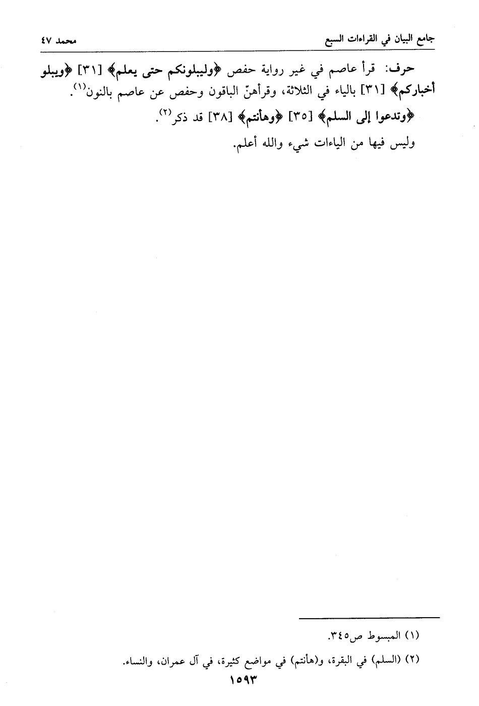 قرأ عاصم في غير رواية حفص وليبلونكم حتى يعلم [31] ويبلو أخباركم [31] بالياء في الثلاثة، وقرأهنّ الباقون وحفص عن عاصم بالنون «1».