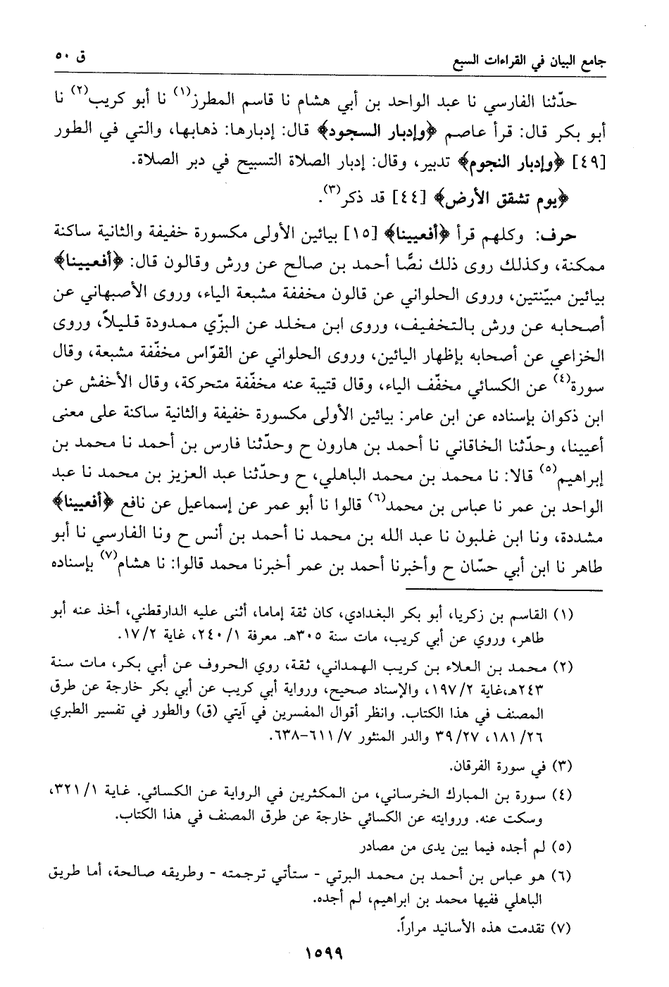 (2) محمد بن العلاء بن كريب الهمداني، ثقة، روي الحروف عن أبي بكر، مات سنة 243 هـ، غاية 2/ 197، والإسناد صحيح، ورواية أبي كريب عن أبي بكر خارجة عن طرق المصنف في هذا الكتاب. وانظر أقوال المفسرين في آيتي (ق) والطور في تفسير الطبري 26/ 181، 27/ 39 والدر المنثور 7/ 611 - 638.