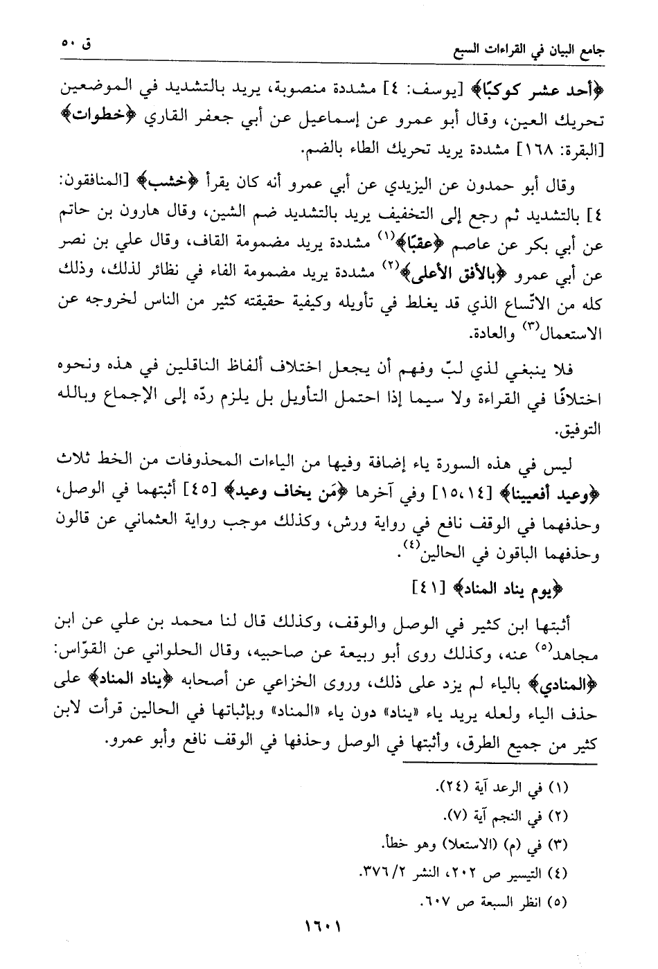 المنادي بالياء لم يزد على ذلك، وروى الخزاعي عن أصحابه يناد المناد على حذف الياء ولعله يريد ياء «يناد» دون ياء «المناد» وبإثباتها في الحالين قرأت لابن كثير من جميع الطرق، وأثبتها في الوصل وحذفها في الوقف نافع وأبو عمرو.