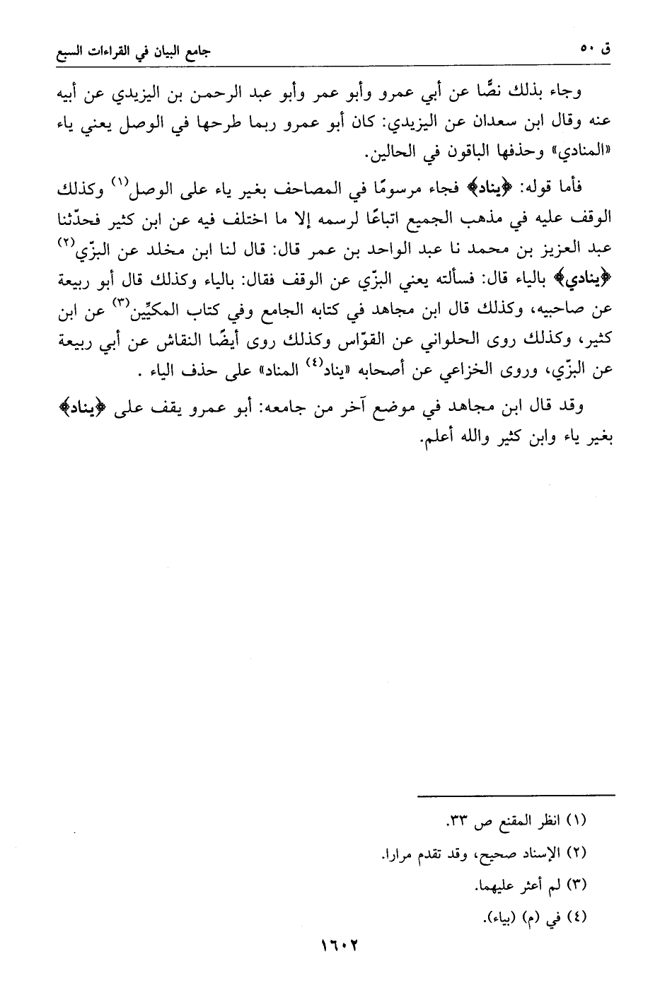 وقد قال ابن مجاهد في موضع آخر من جامعه: أبو عمرو يقف على يناد بغير ياء وابن كثير والله أعلم.