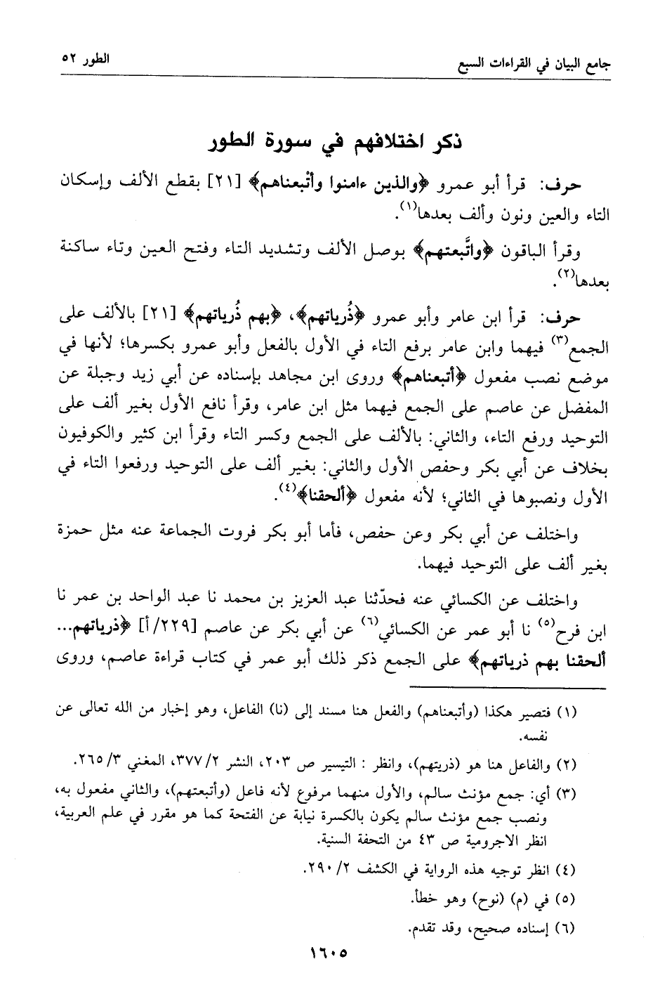قرأ ابن عامر وأبو عمرو ذرياتهم، بهم ذرياتهم [21] بالألف على الجمع «3» فيهما وابن عامر برفع التاء في الأول بالفعل وأبو عمرو بكسرها؛ لأنها في موضع نصب مفعول أتبعناهم وروى ابن مجاهد بإسناده عن أبي زيد وجبلة عن المفضل عن عاصم على الجمع فيهما مثل ابن عامر، وقرأ نافع الأول بغير ألف على التوحيد ورفع التاء، والثاني: بالألف على الجمع وكسر التاء وقرأ ابن كثير والكوفيون بخلاف عن أبي بكر وحفص الأول والثاني: بغير ألف على التوحيد ورفعوا التاء في الأول ونصبوها