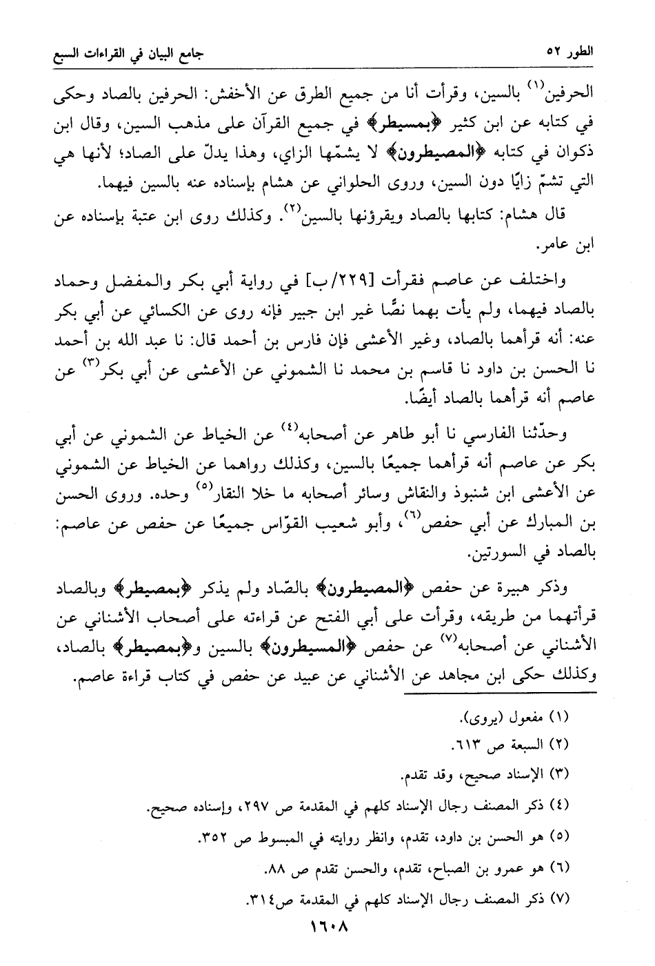 وذكر هبيرة عن حفص المصيطرون بالصّاد ولم يذكر بمصيطر وبالصاد قرأتهما من طريقه، وقرأت على أبي الفتح عن قراءته على أصحاب الأشناني عن الأشناني عن أصحابه «7» عن حفص المسيطرون بالسين وبمصيطر بالصاد، وكذلك حكى ابن مجاهد عن الأشناني عن عبيد عن حفص في كتاب قراءة عاصم.