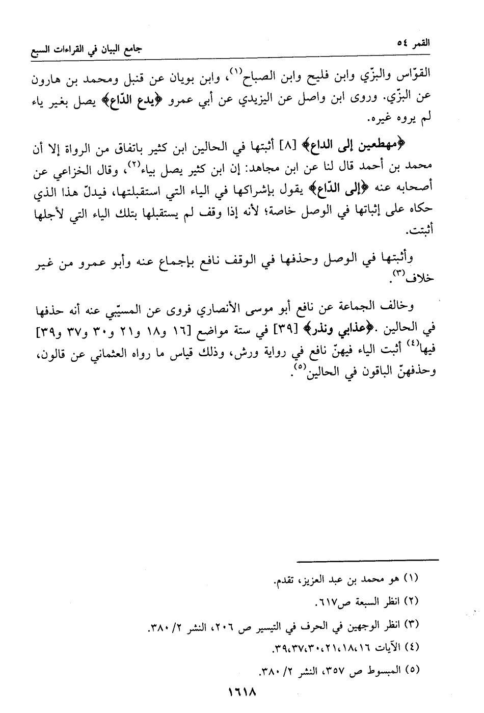 مهطعين إلى الداع [8] أثبتها في الحالين ابن كثير باتفاق من الرواة إلا أن محمد بن أحمد قال لنا عن ابن مجاهد: إن ابن كثير يصل بياء «2»، وقال الخزاعي عن أصحابه عنه إلى الدّاع يقول بإشراكها في الياء التي استقبلتها، فيدلّ هذا الذي حكاه على إثباتها في الوصل خاصة؛ لأنه إذا وقف لم يستقبلها بتلك الياء التي لأجلها أثبتت.